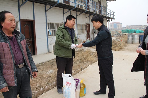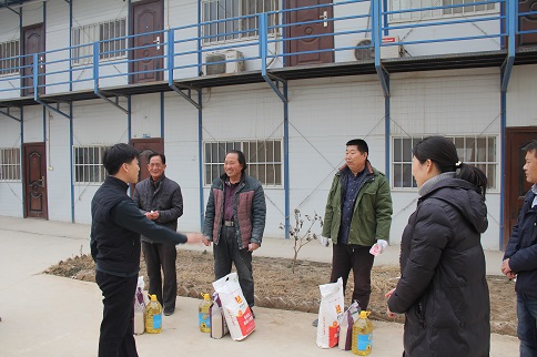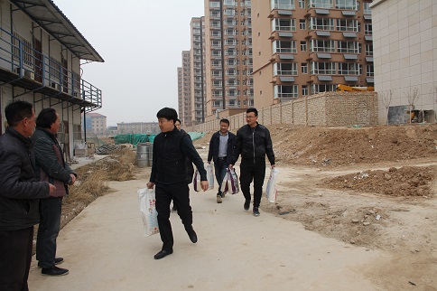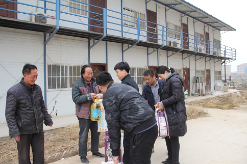 陳朋飛同志充分肯定了大家對(duì)公租房建設(shè)所做的貢獻(xiàn),他說:“你們是公租房建設(shè)的功臣,是你們的智慧和力量,是你們長(zhǎng)期以來的辛勞付出,這一座座高樓才得以拔地而起,我代表公司黨支部感謝你們!”隨后,陳朋飛同志代表公司黨支部將大米、白面、食用油等慰問品和500元慰問金分別送到三名農(nóng)民工代表薛敬軍、魚明星和陳新院的手中。